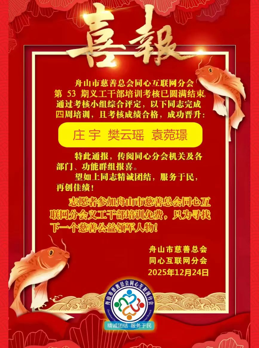 舟山市慈善总会同心互联网分会第五十三期义工干部培训考核工作圆满落幕舟山市慈善总会同心互联网分会第五十三期义工干部培训考核工作圆满落幕。历经四周系统培训与严格考核,经同心分会考核小组民主投票表决,以下同志顺利通过考评,光荣当选为同心互联网分会义工干部!来源:超级管理员 2026-01-09 -